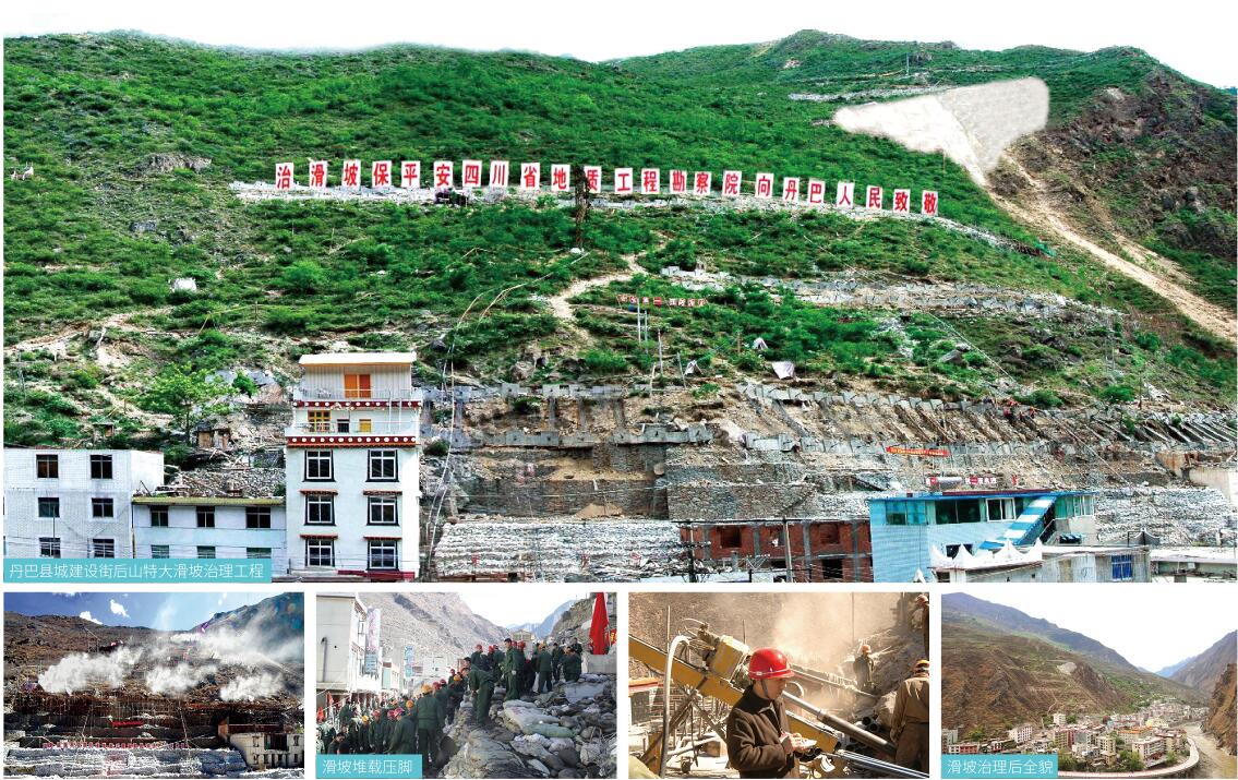 2005年1月,甘孜州丹巴縣城建設(shè)街后山特大滑坡(225萬(wàn)方)突發(fā)變形,其變形速度之大、危害之嚴(yán)重、應(yīng)急治理難度之大屬?lài)?guó)內(nèi)罕見(jiàn)。滑坡直接威脅丹巴縣城存亡。川勘集團(tuán)臨危受命,大膽創(chuàng)新,制定出“前緣堆載、滑坡體實(shí)施錨索、框格梁鎖住滑坡”的科學(xué)治滑方案,冒著生命危險(xiǎn),拼時(shí)間搶速度,“邊滑邊治”,最終勝利完成四川省委省政府“力爭(zhēng)不滑坡、確保不死人”的任務(wù),實(shí)現(xiàn)了滑坡治理史上的一個(gè)世界性創(chuàng)舉。